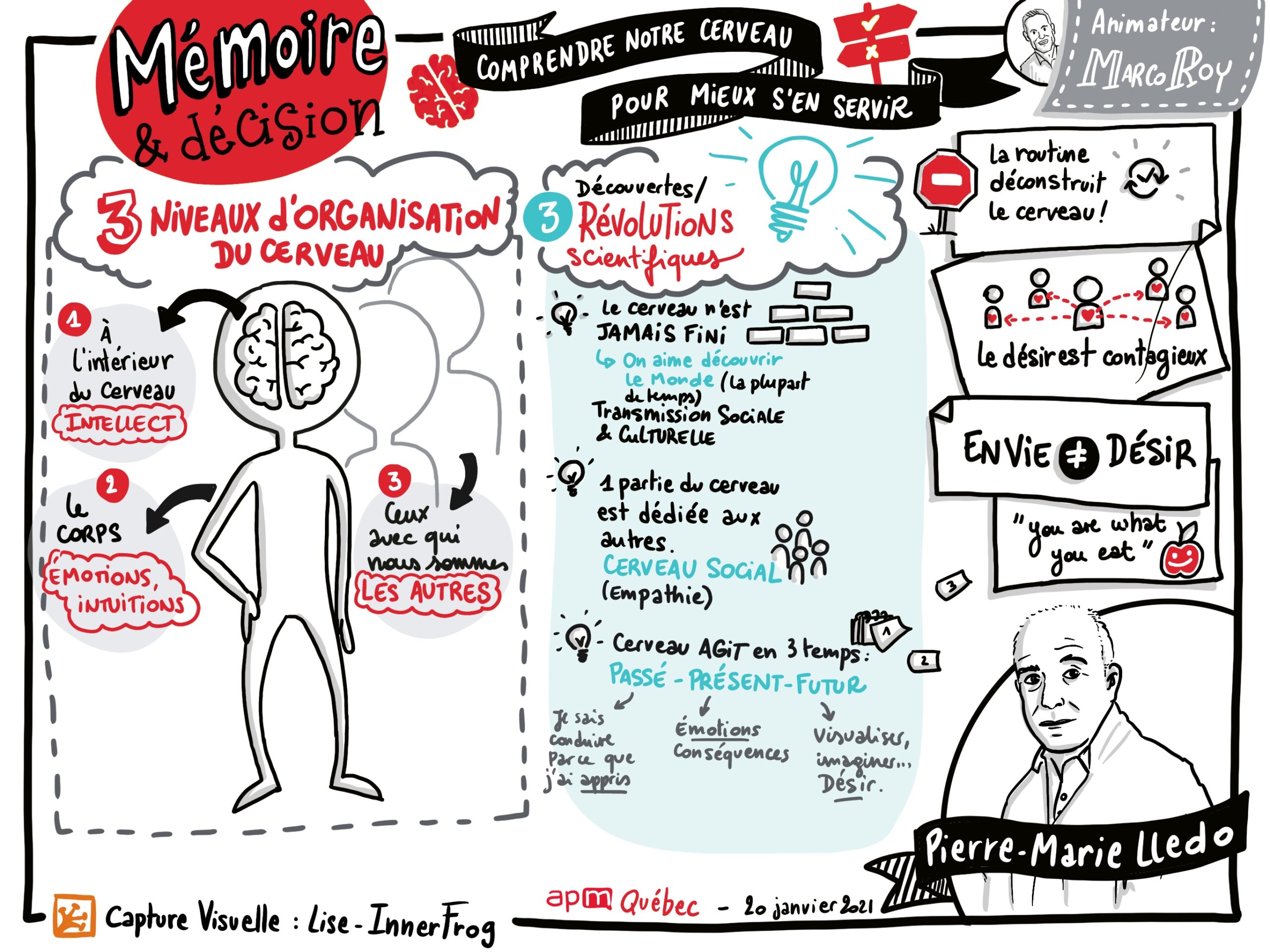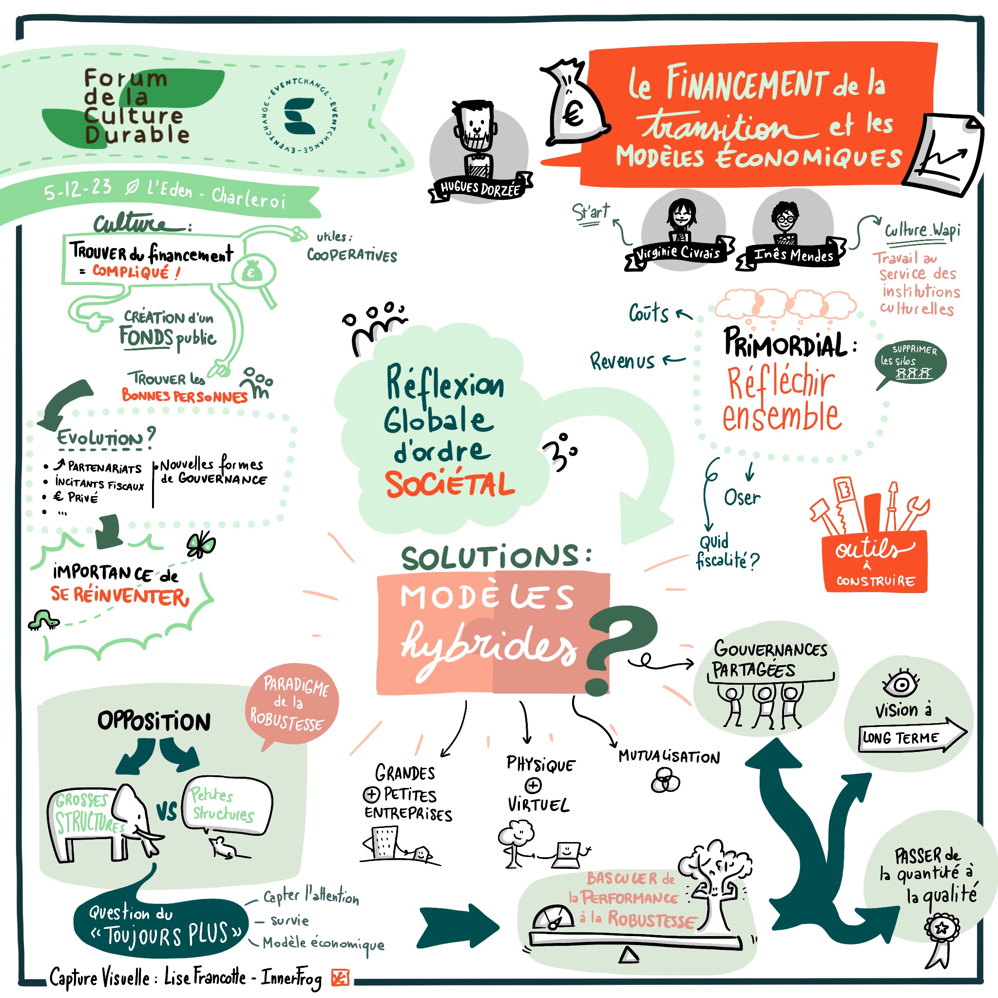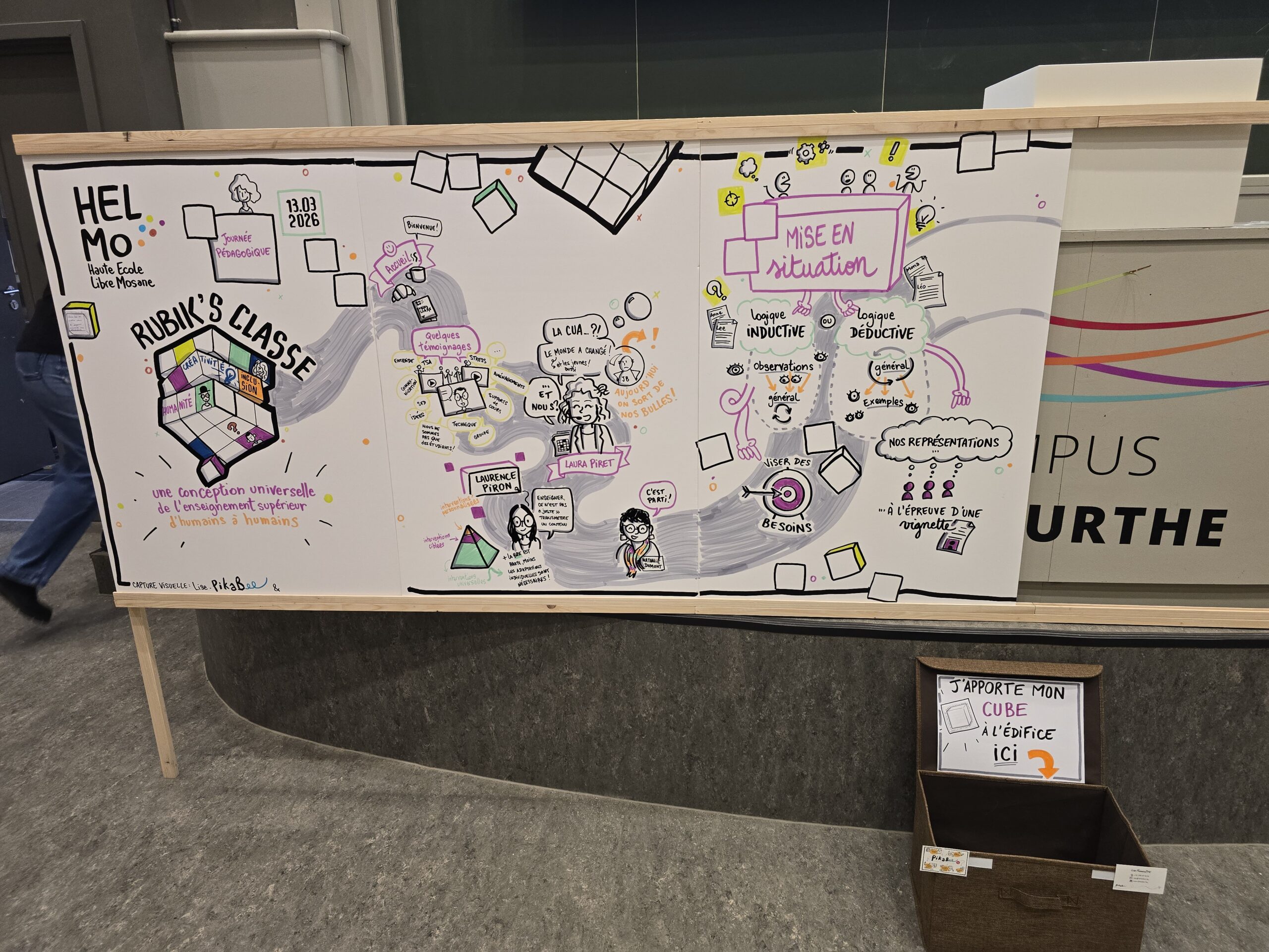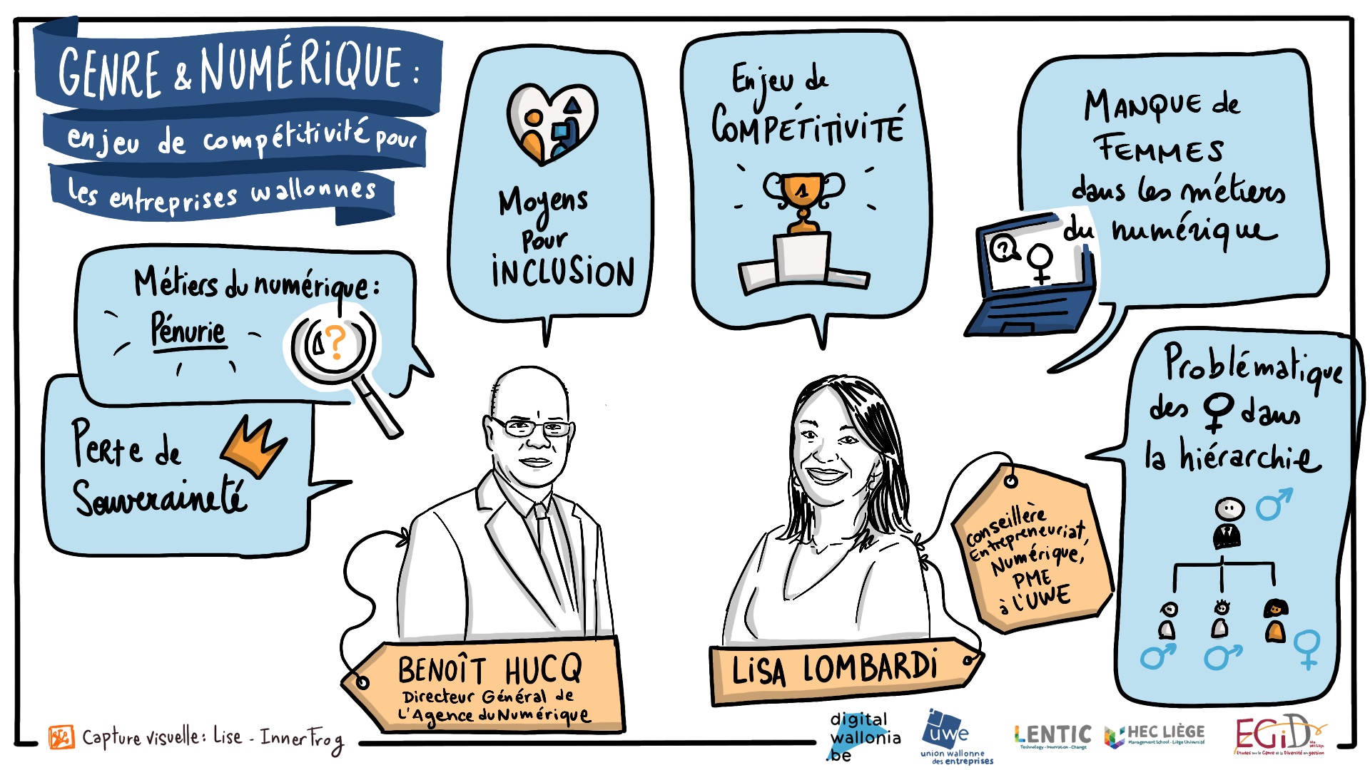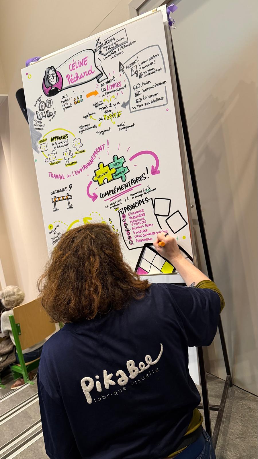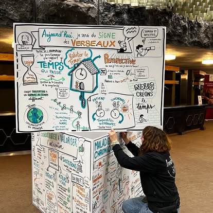 In a visual way, we capture in real time or deferred a discussion or speech during a meeting, an event, a seminar or a workshop. This is called visual capture (orlive graphic recording).