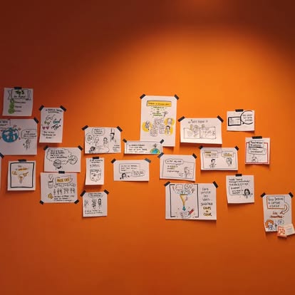 On large sheets of paper glued to the wall (or on our mobile wall) to provide a blank canvas. The neutral facilitator uses markers and pastels to capture the content in the form of drawings, text and movements.
